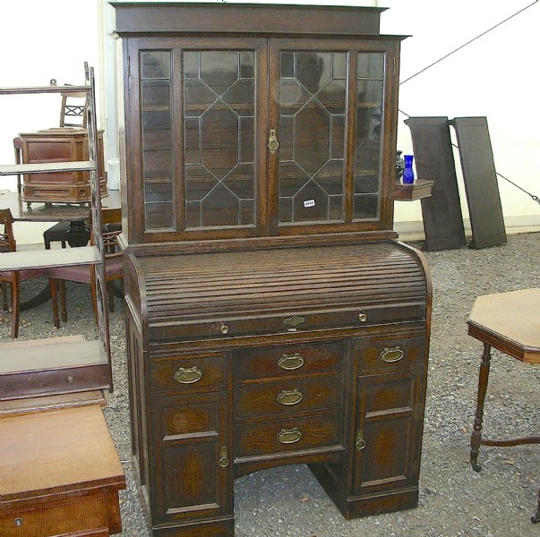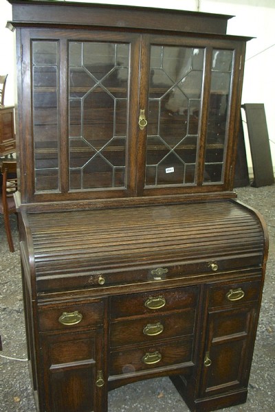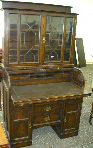 An English oak Roll top desk with bookcase above. The bookcase has a small up stand and moulded top edge over leadlight doors enclosing adjustable shelves. The base has a tambour door that encloses an arrangement of pigeon holes and drawers. The writing surface has a leather insert and pulls forward for extra work surface. Beneath there are five drawers and two doors all with decorative brass handles.