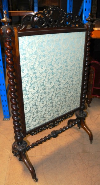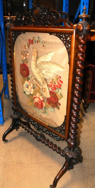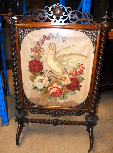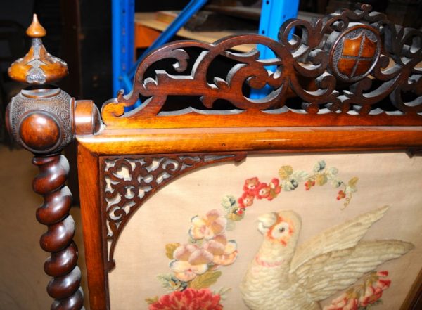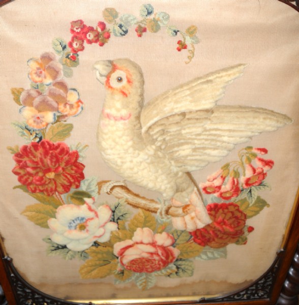 A Rosewood fire screen. This early to mid Victorian fire screen is of premium quality. The Berlin work cloth panel depicting a parrot is raised on Jacobean twist supports terminating with finials. The top has a shaped fret work pediment, the screen corners and base are same. No restoration is required.