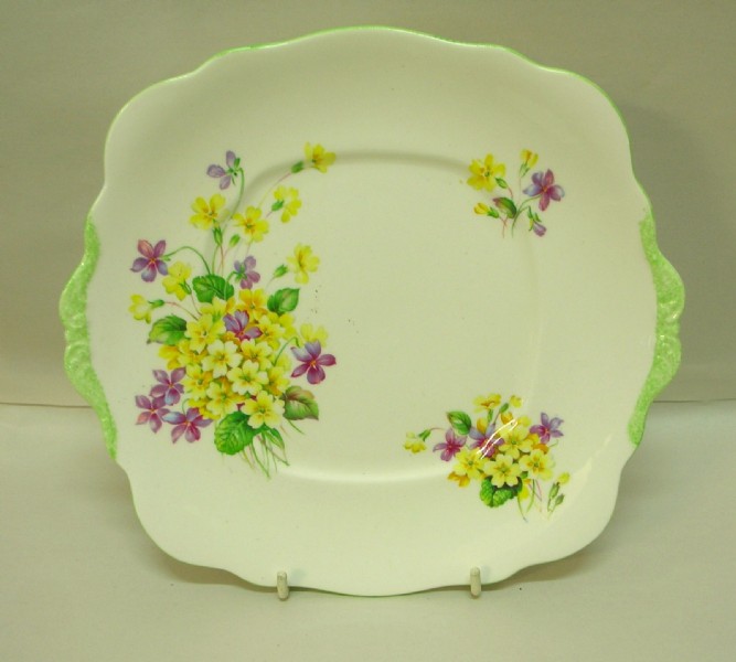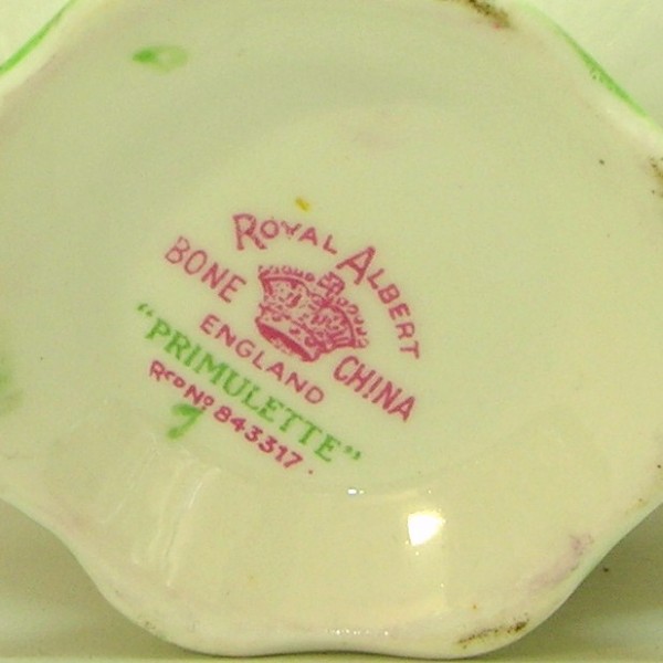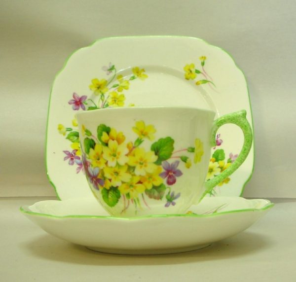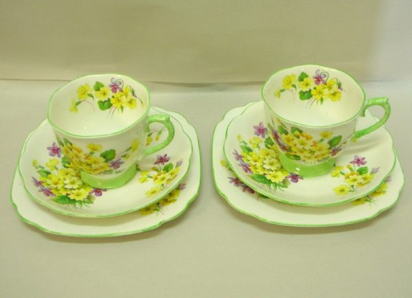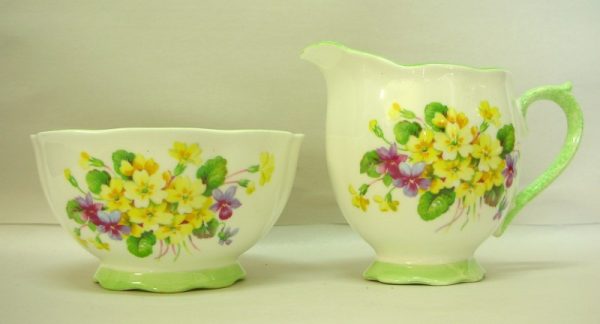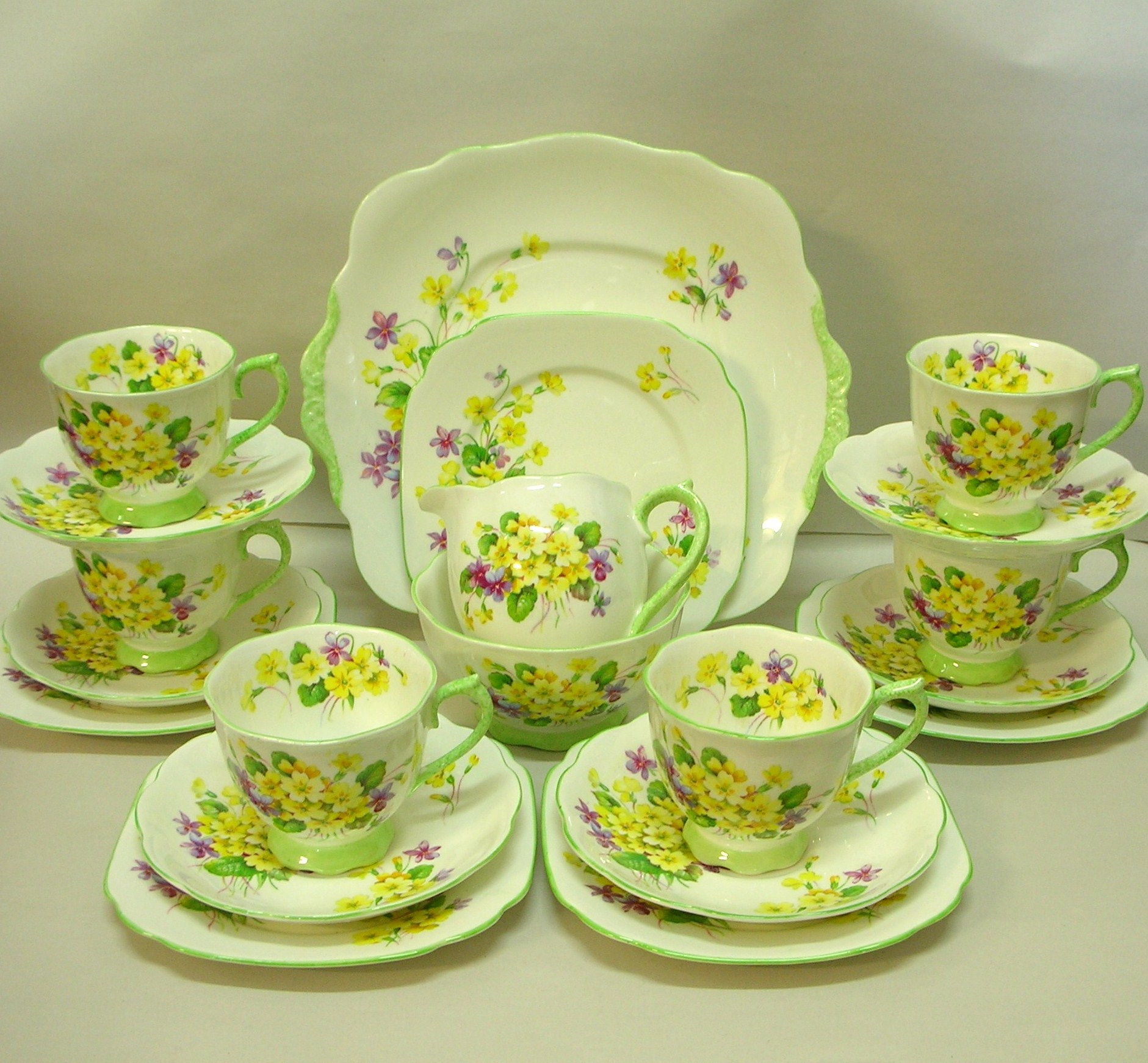 Royal Albert “primulette” tea service. Includes – six tea cups, six saucers, six bread and butter plates, milk jug, sugar bowl and cake plate.