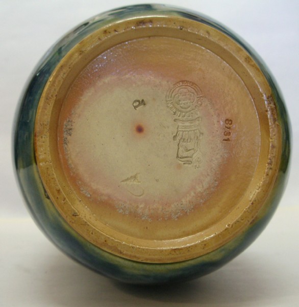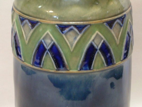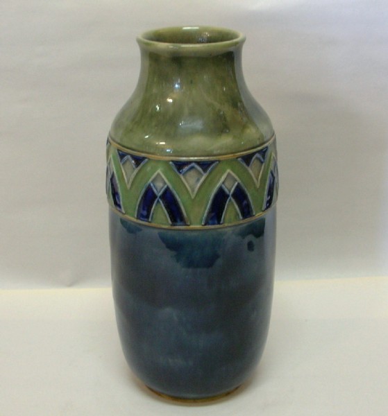 Royal Doulton art deco vase in green & blue glazes with geometrical boarder pattern, signed by Christine Abbort.