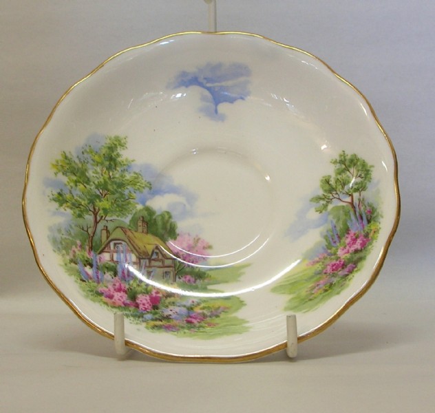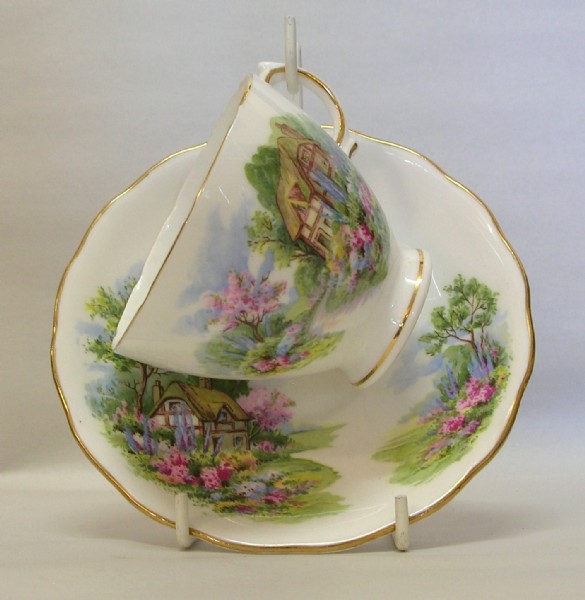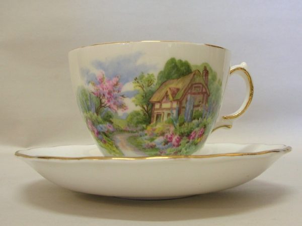 Royal Vale “Cottage Scene” cup & saucer with gilt edging