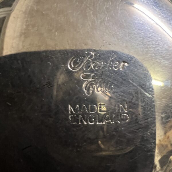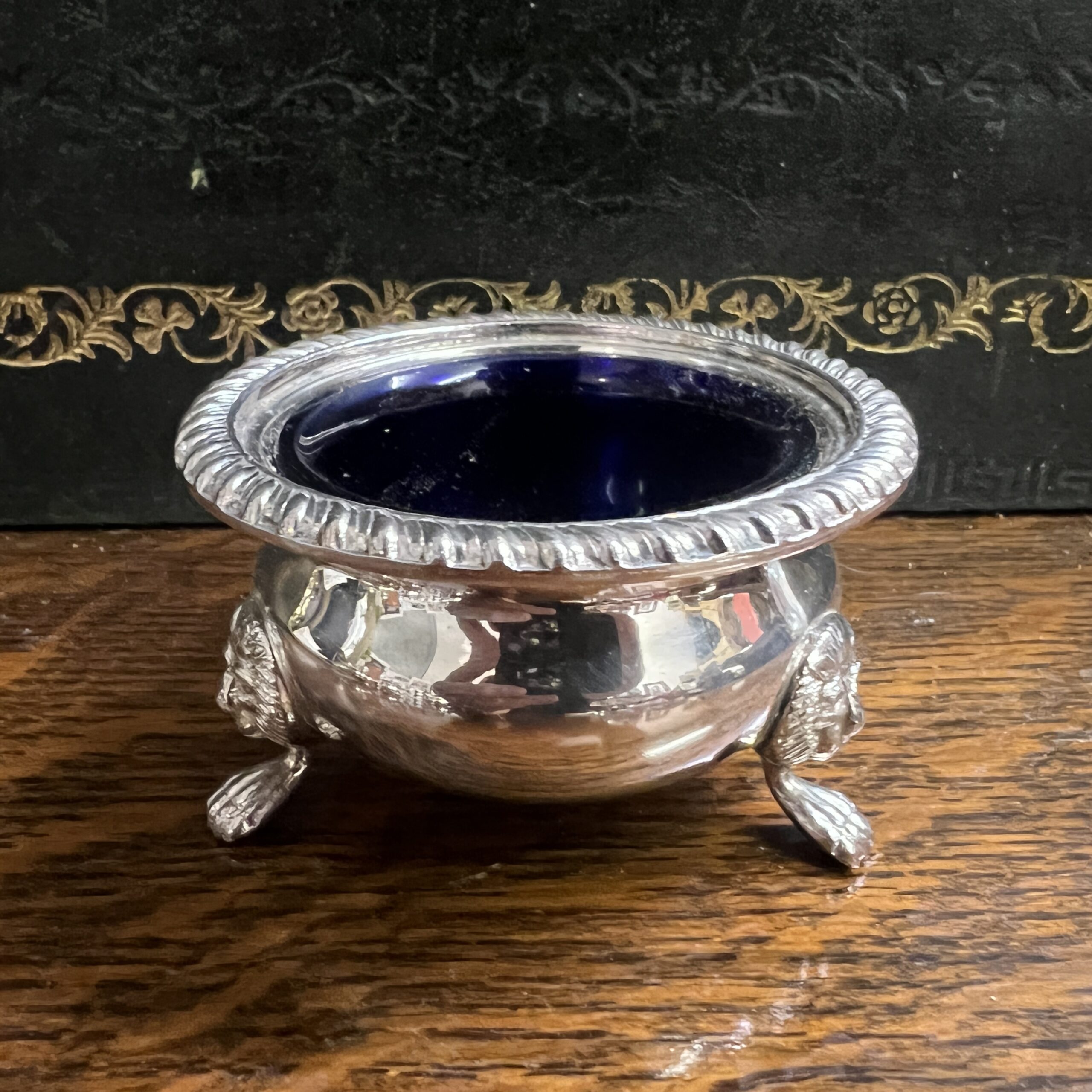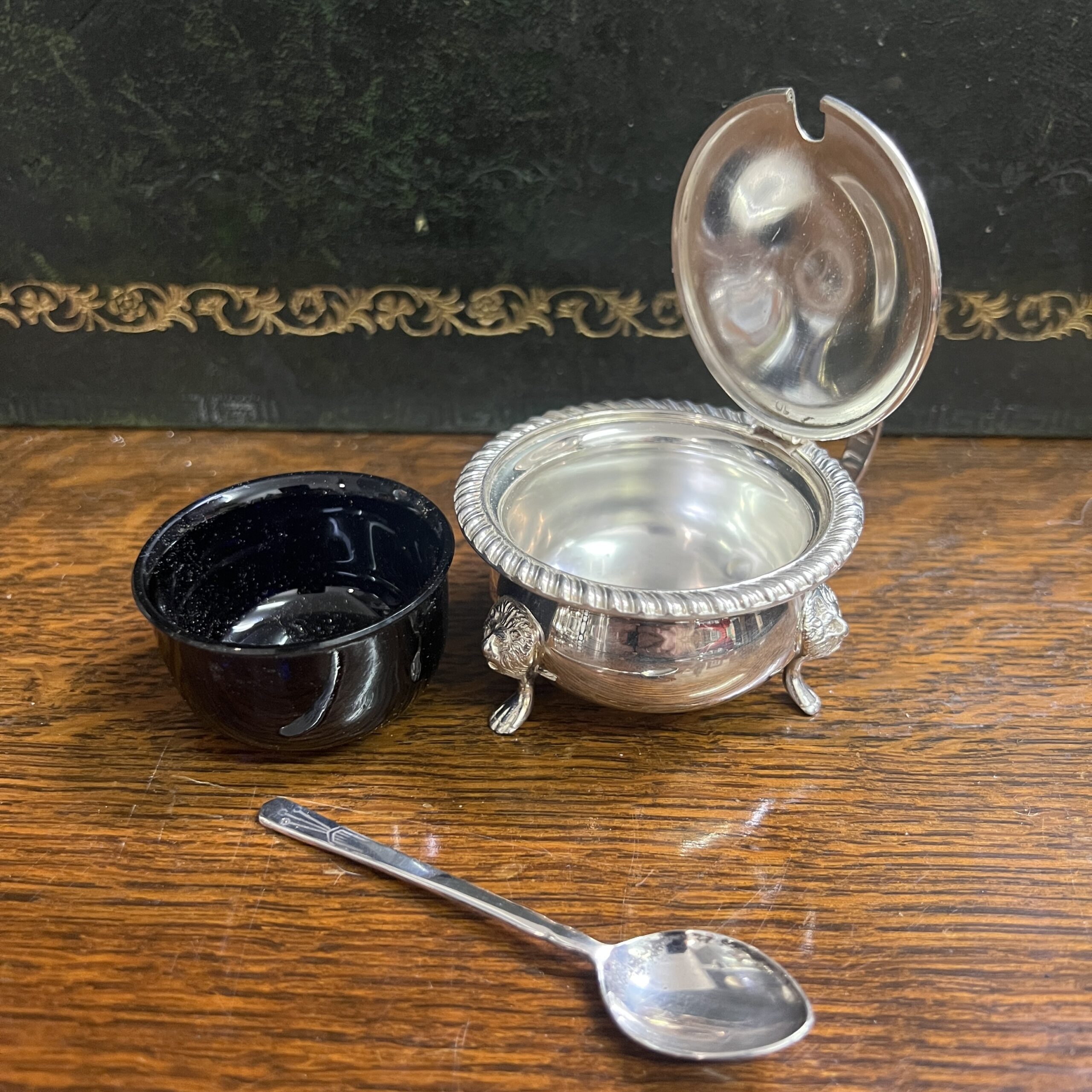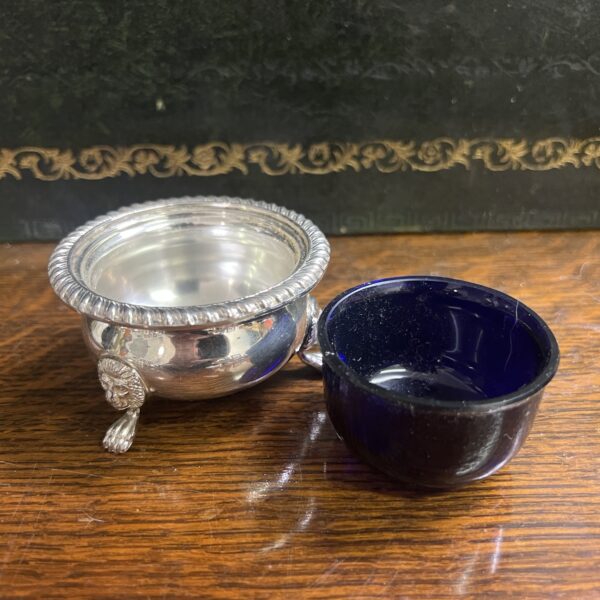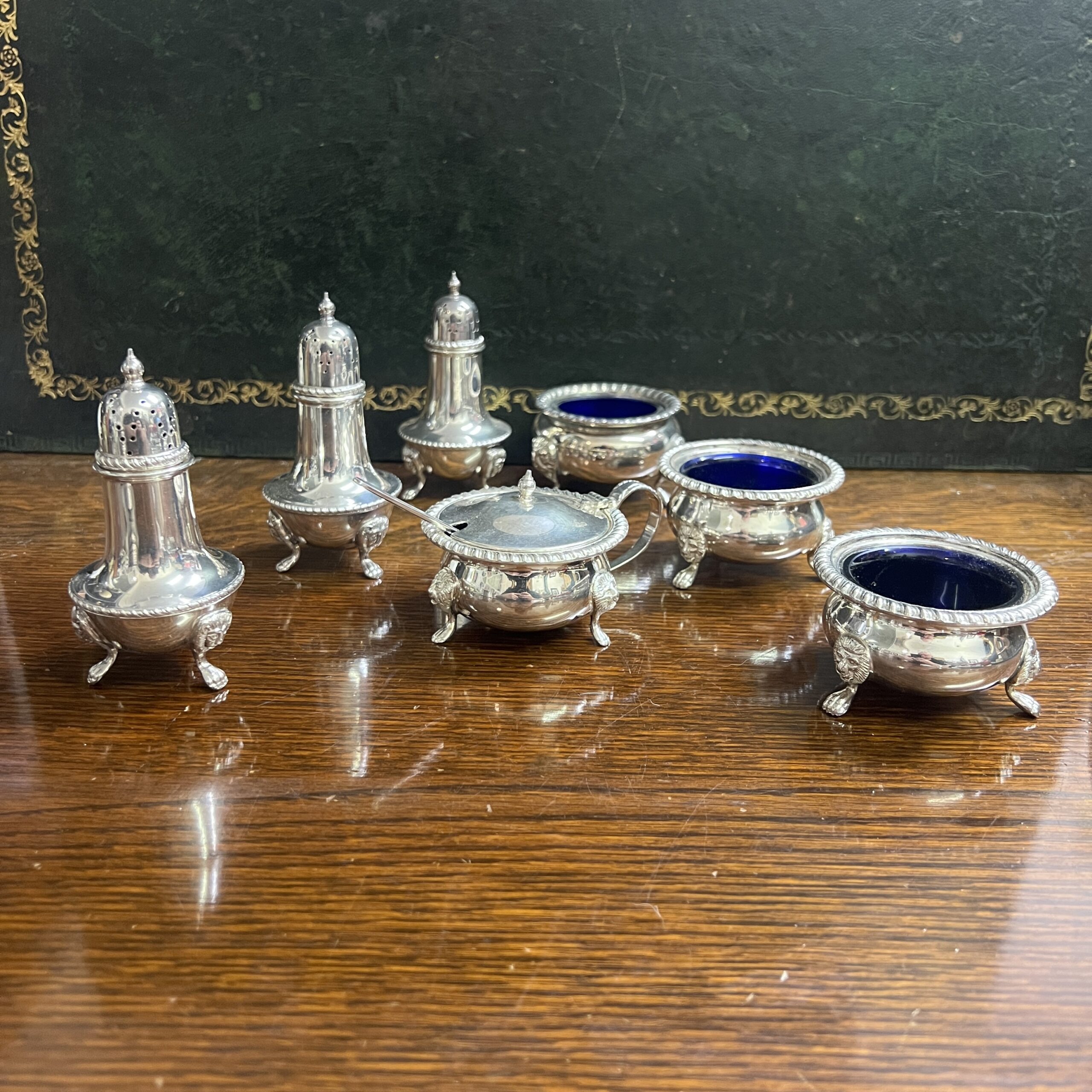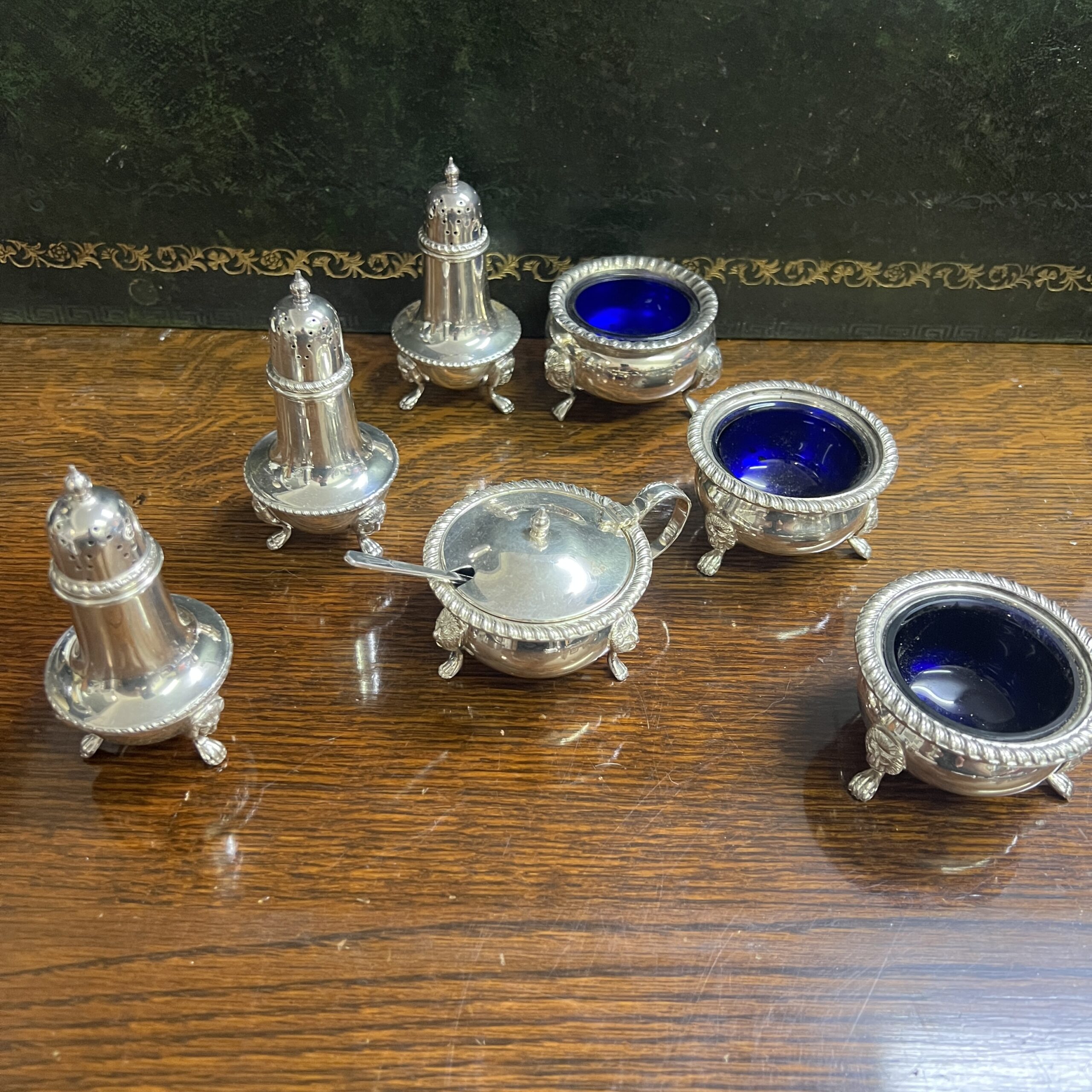 A 1920’s Barker Ellis silver plated 7 piece cruet set comprising 3 x salts 3 x pepper pots and a mustard pot with spoon, the salts and mustard pot with blue glass liners