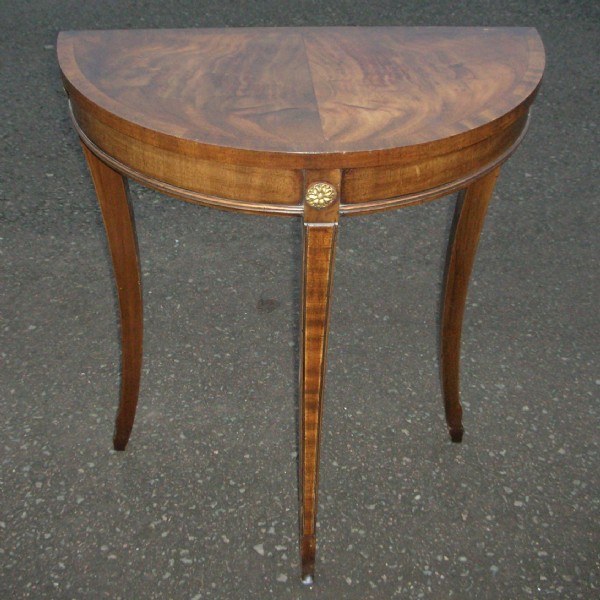 Small Demi Lune walnut side tale with three out swept legs. Makers label “Maple”