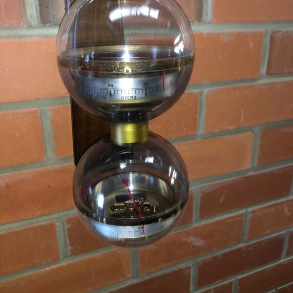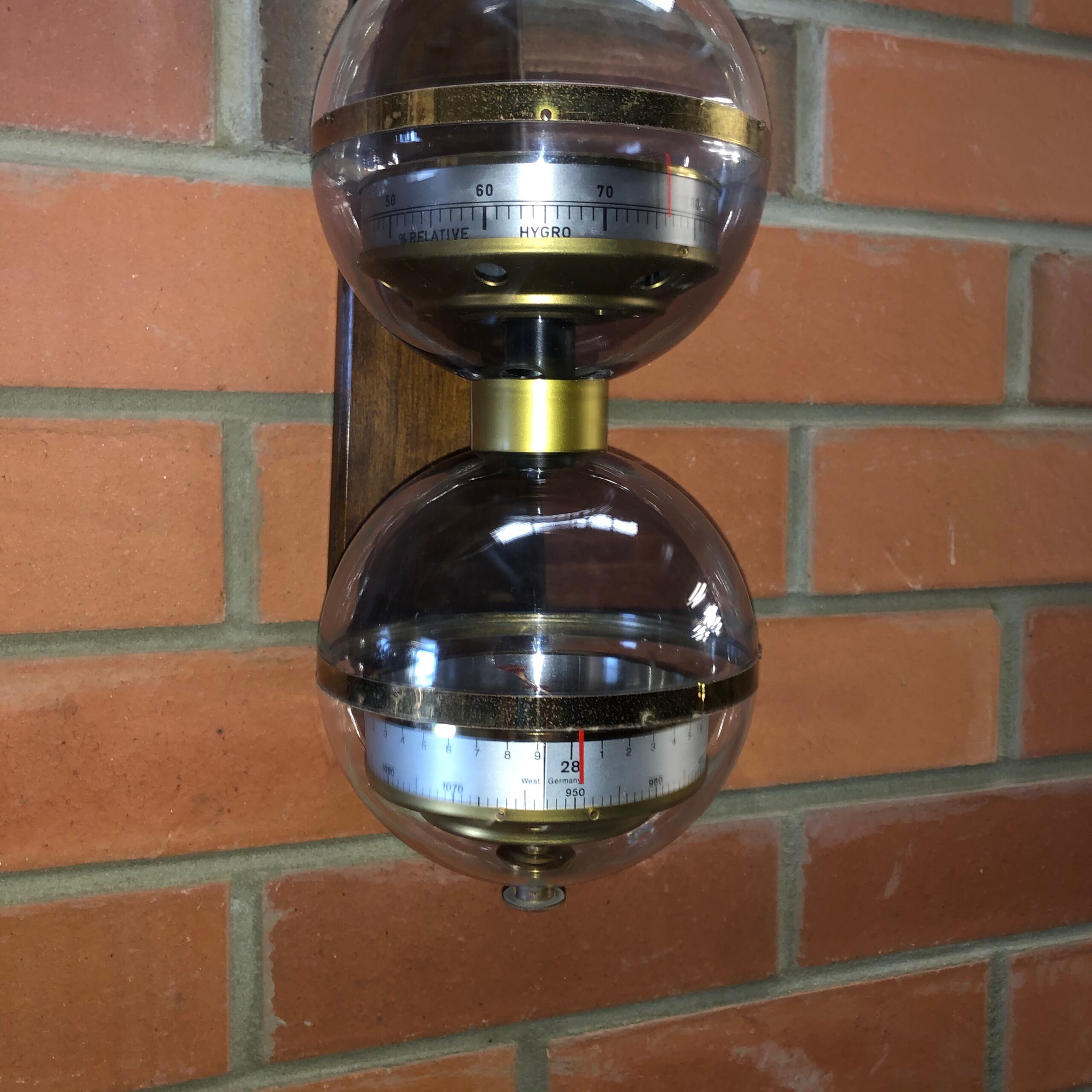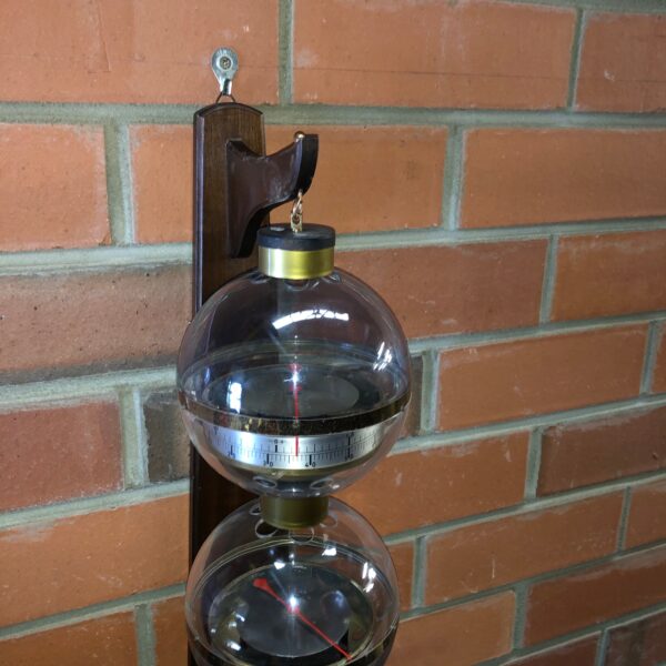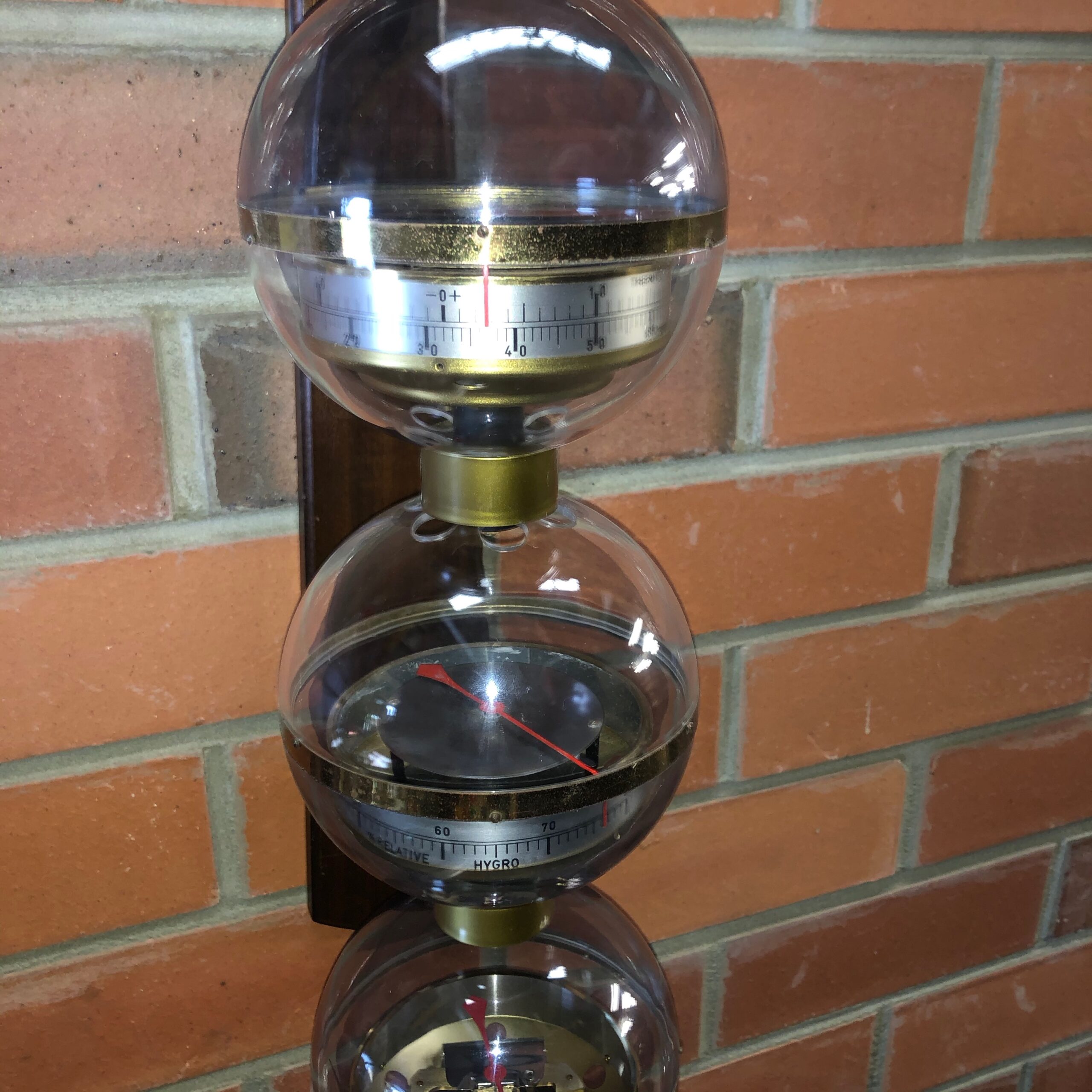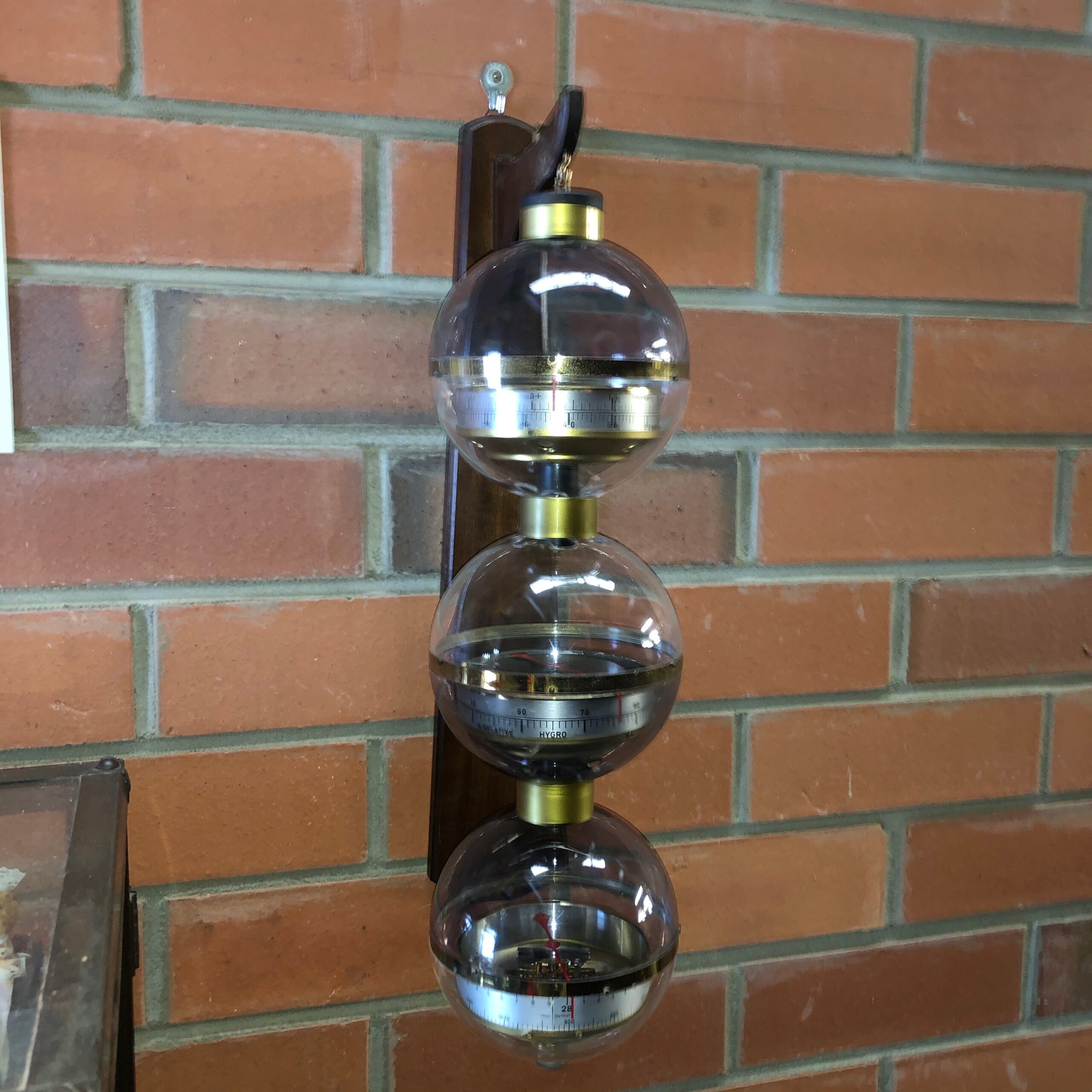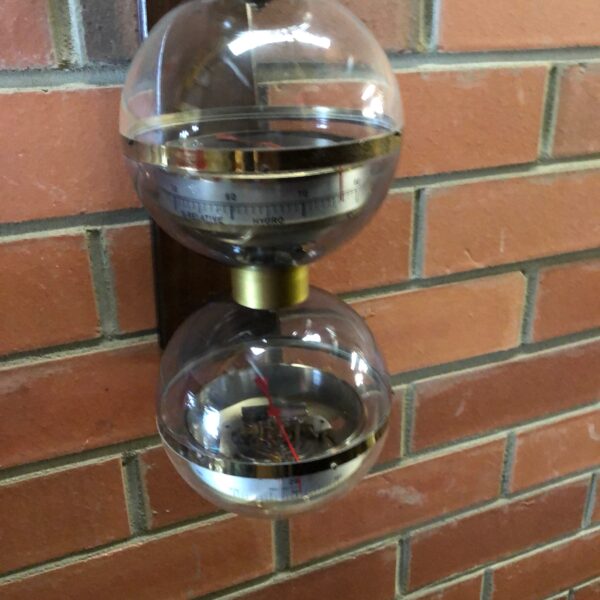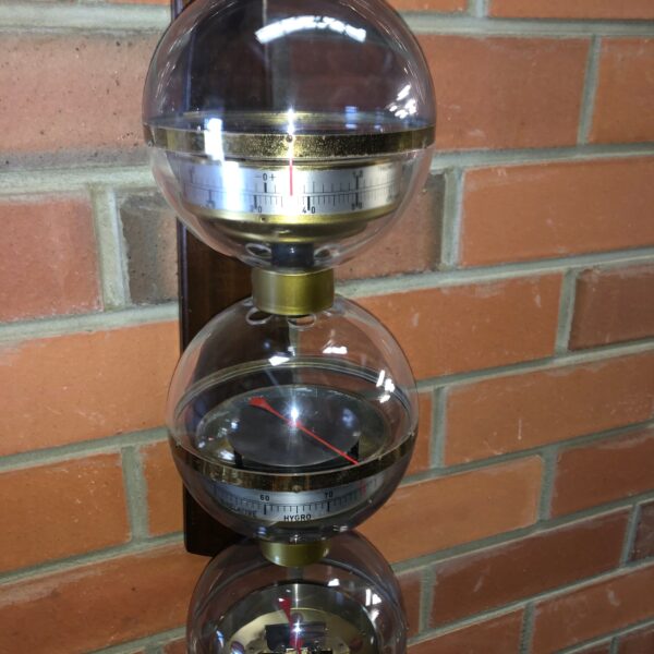 Unusual mid century West Germany triple sphere hanging weather station Space Atomic Era with triple sphere B.G.M. weather station that features from top to bottom; thermometer in both celsius and fahrenheit, a hygrometer and a barometer hanging from a wooden wall bracket circa 1960 BGM
