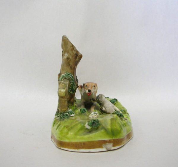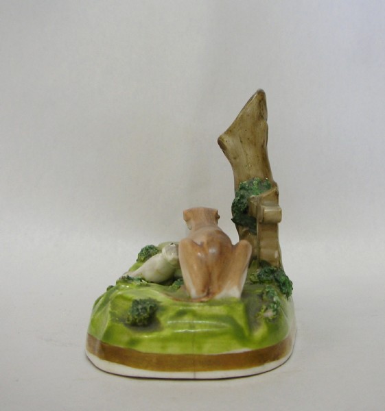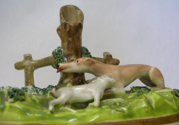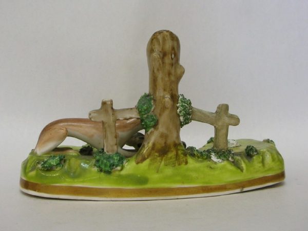 Staffordshire 19th Century Hand Painted “Greyhound With His Catch – Hare”, In Front Of An Old Wooden Fence Figurine.