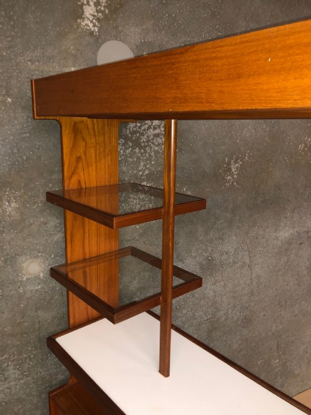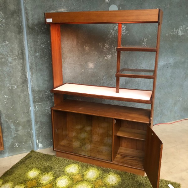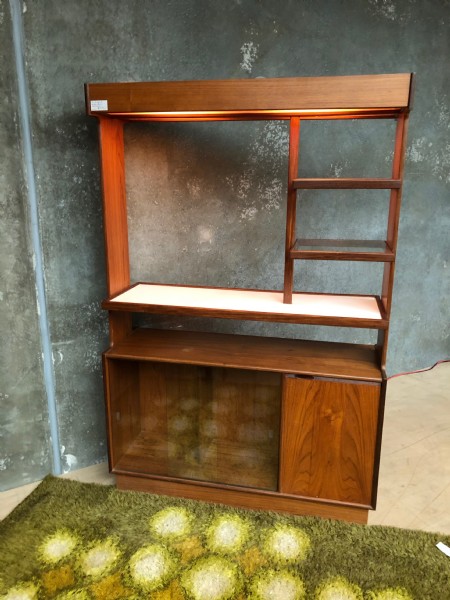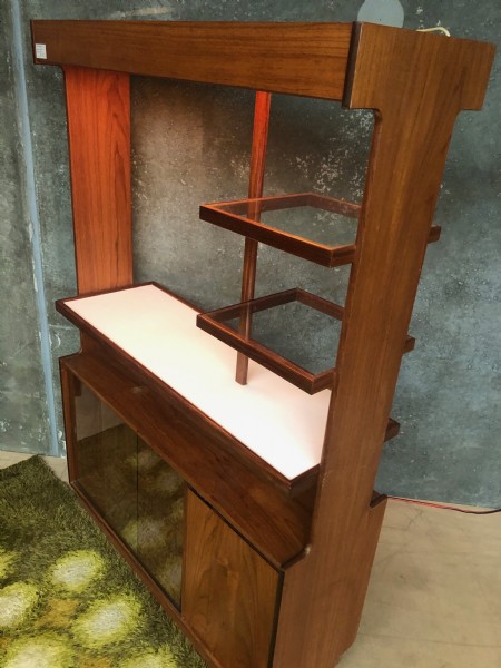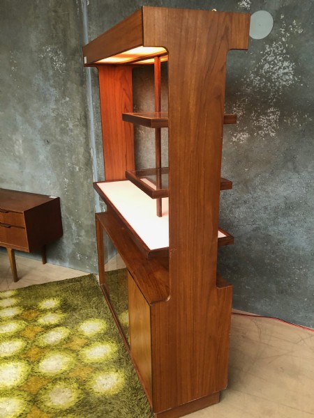 A Turnbridge of London mid century teak bar and room divider. The pelmet has internal lighting with a diffuser, two glass shelves and a spill resistant bar top over an open shelf. The base has two sliding glass doors and a single teak door that enclose an internal shelf. The reverse side has three teak panels on a plinth base