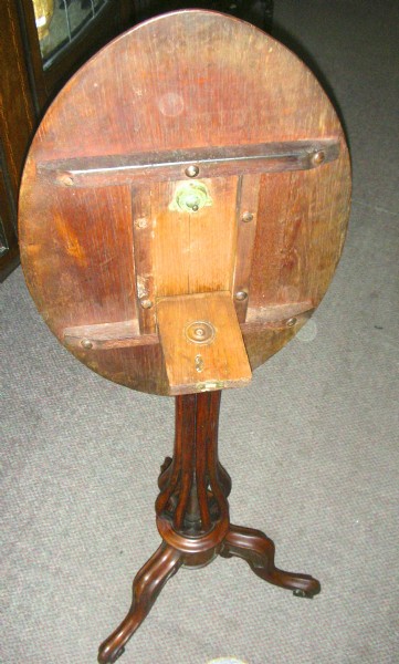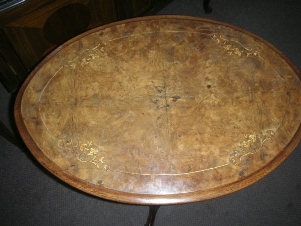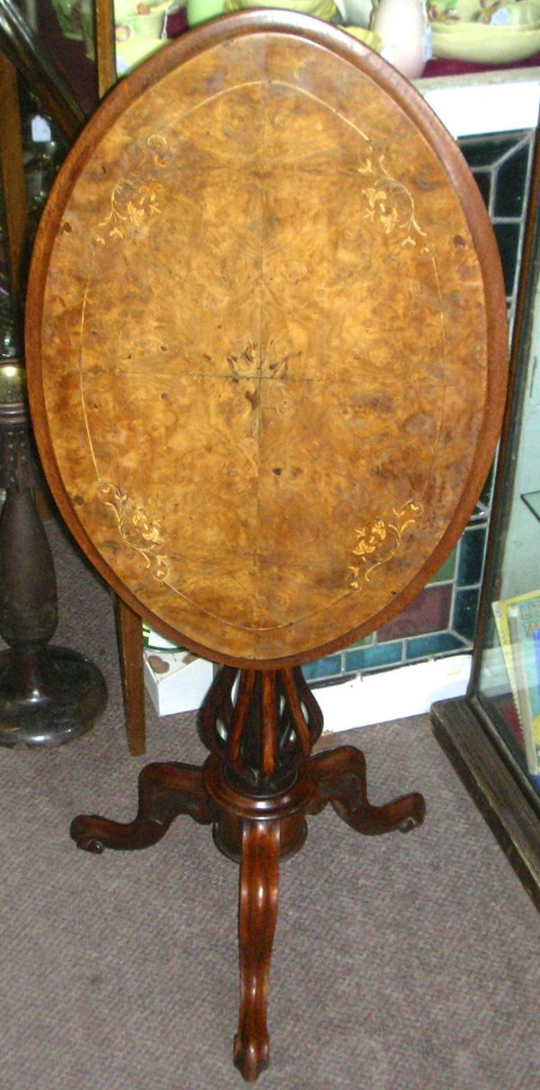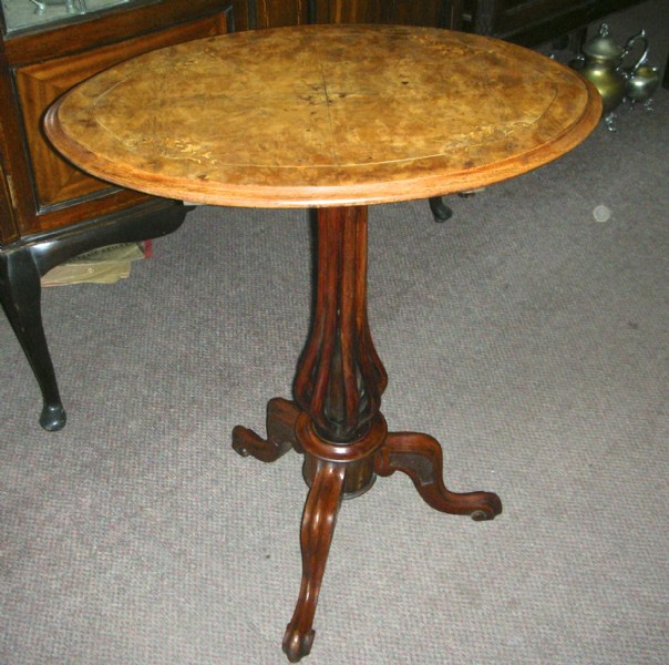 A Mid Victorian Burr Walnut tilt top wine table with marquetry inlaid top above open bulbous pedestal with three carved an shaped legs