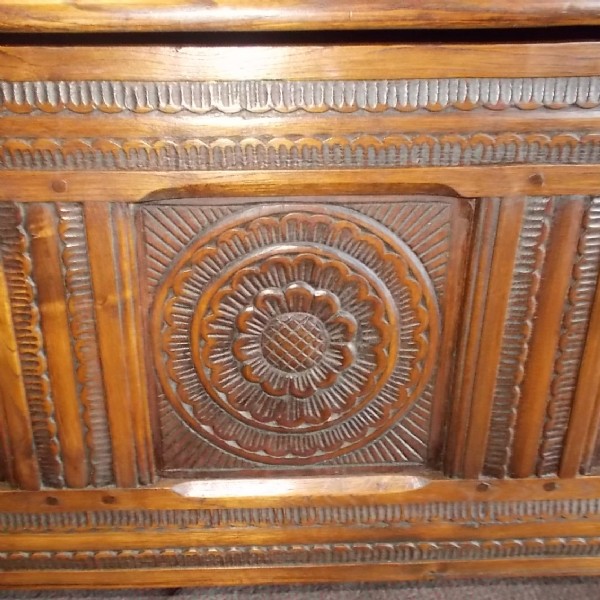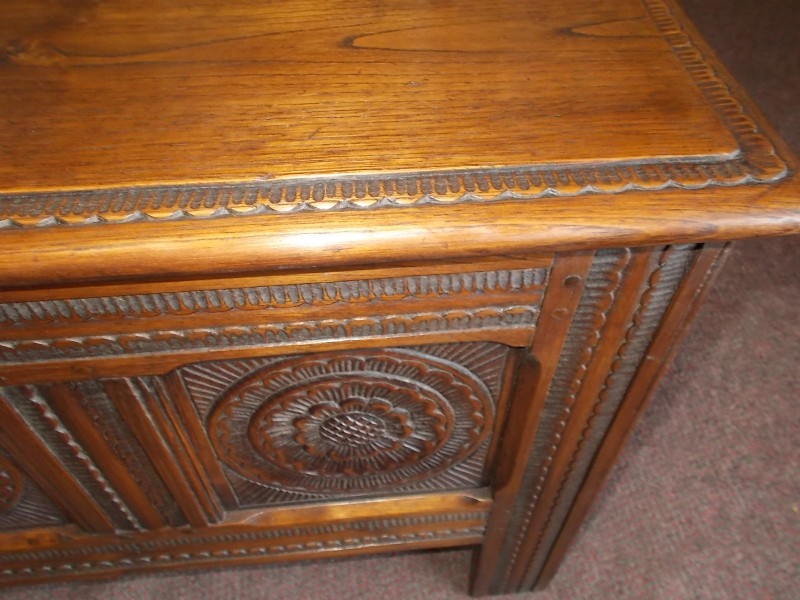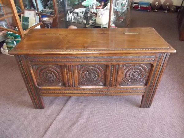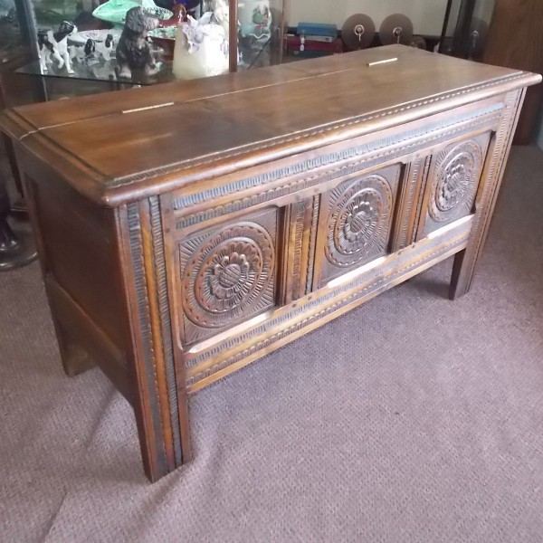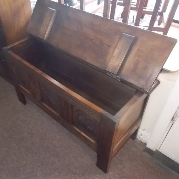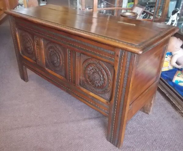 Victorian Elm carved peg jointed blanket box with English Rose panels
