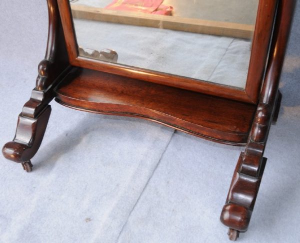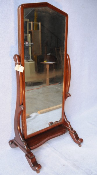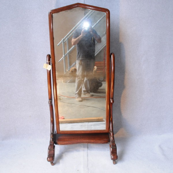 A mid Victorian mahogany full length cheval mirror, the framed mirror terminates with a peak and swivels back and forth. The shaped supports sweep forward and backwards. Standing on a platform base with shaped stretcher.