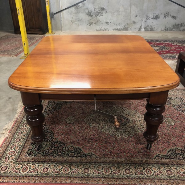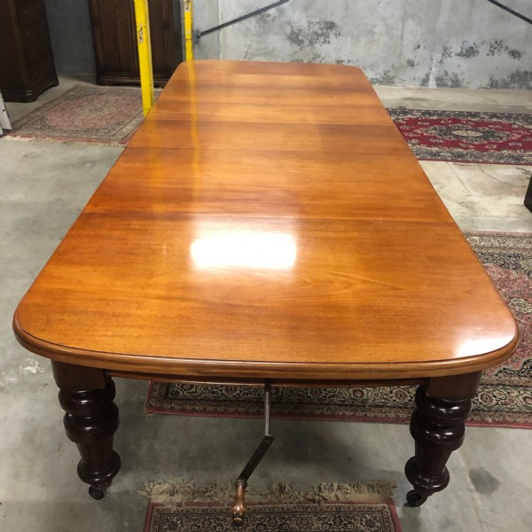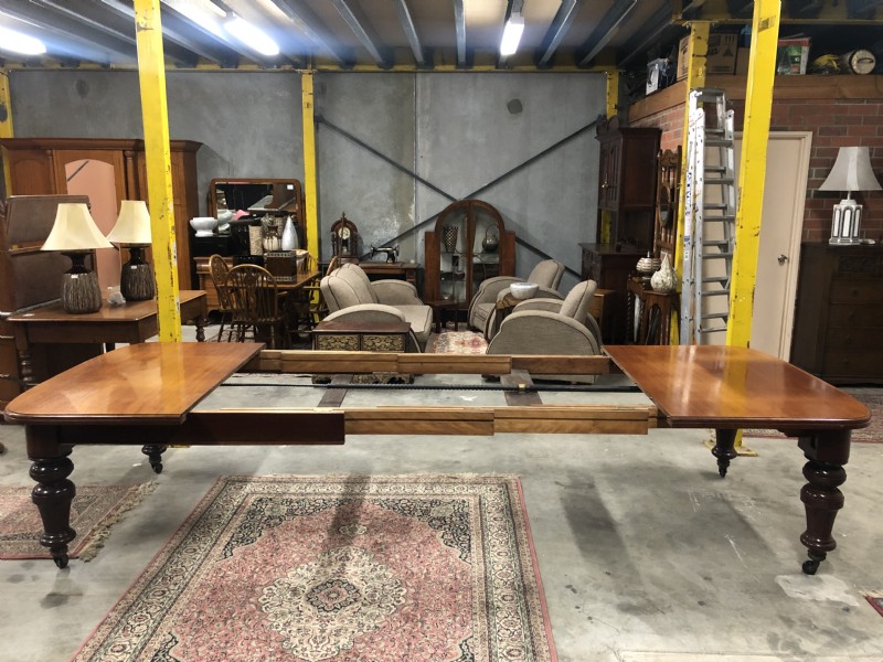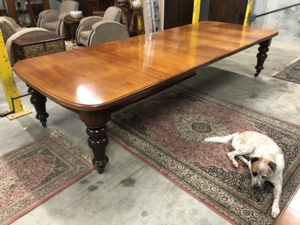 Large 14 seater Victorian mahogany extension dining table with 5 removable leaves, raised on turned legs with casters