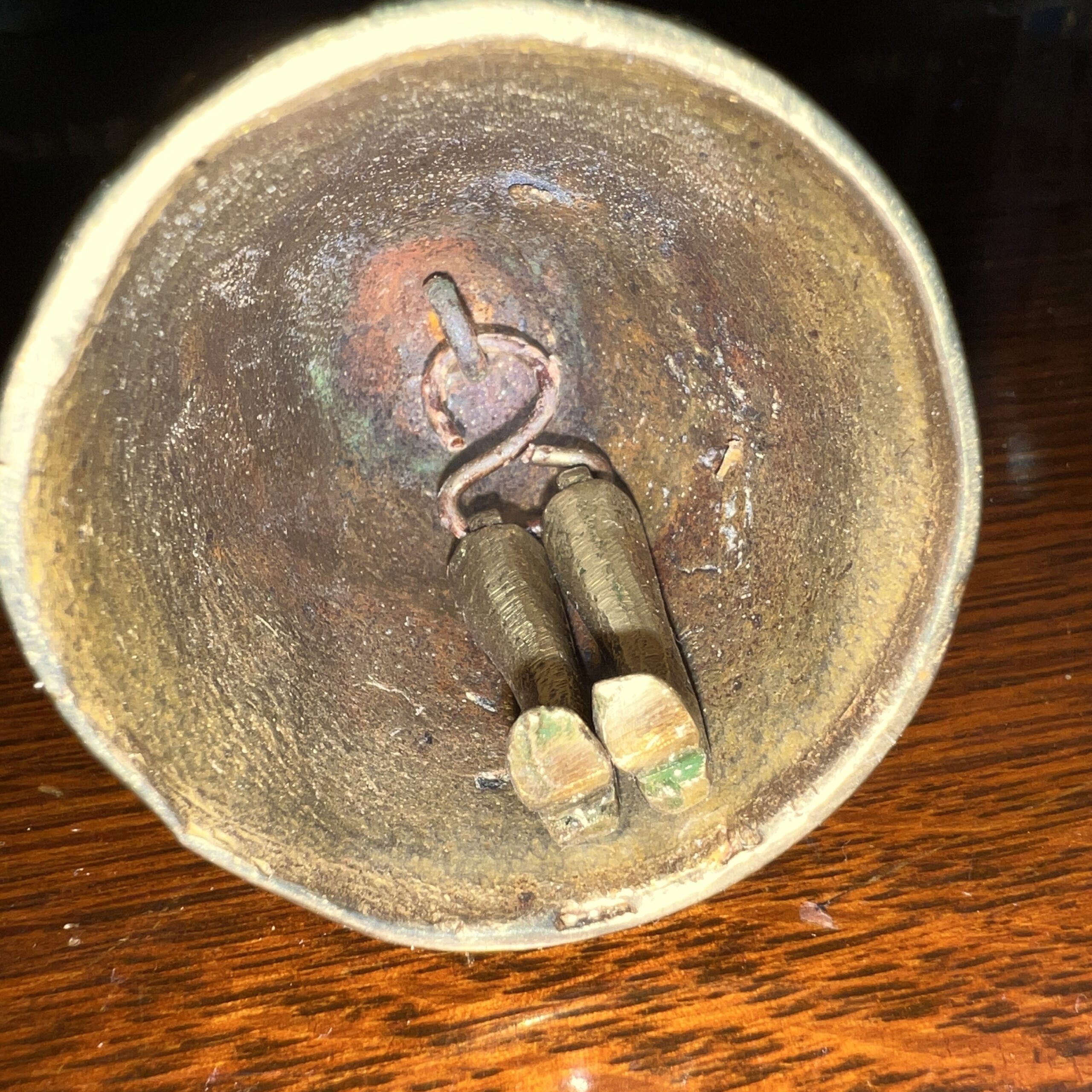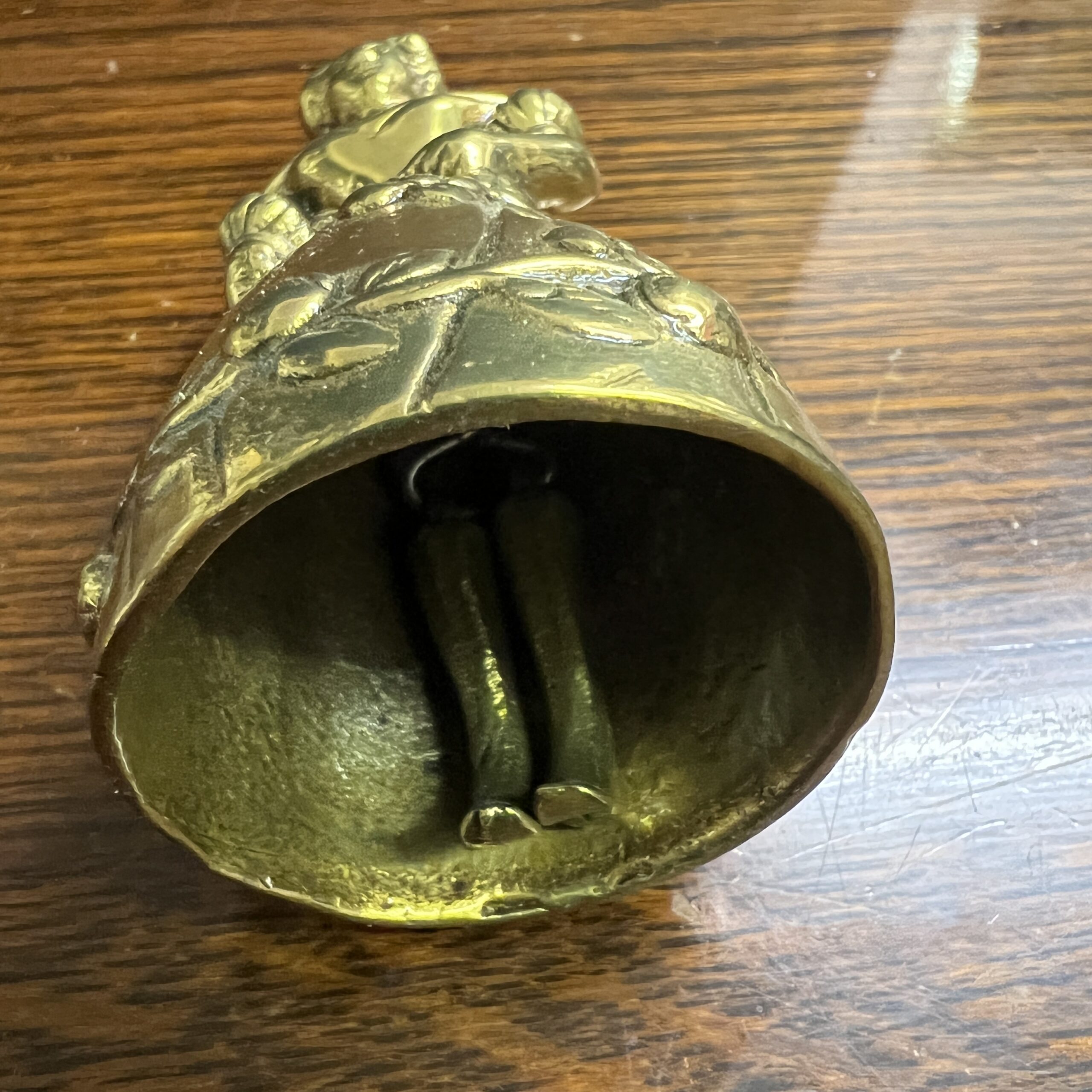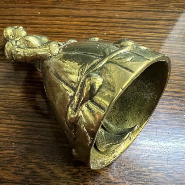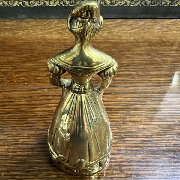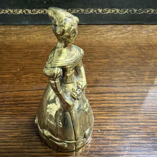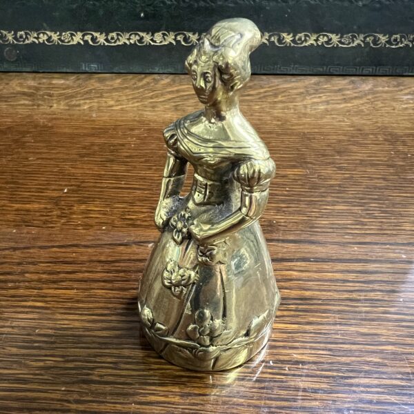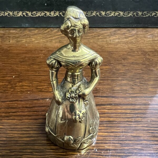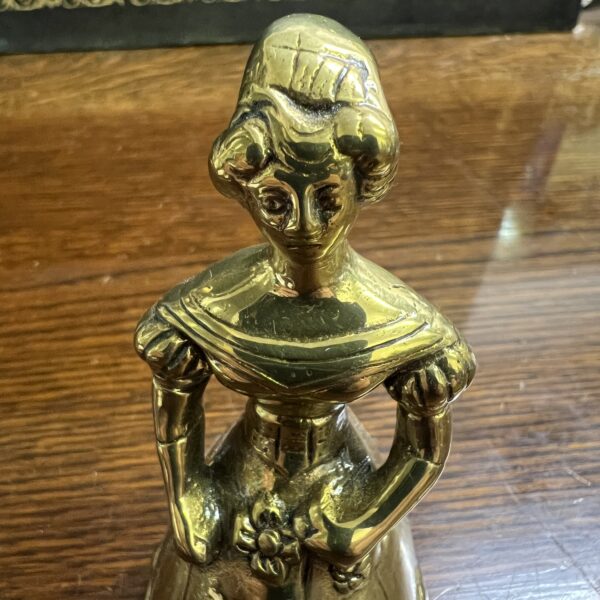 A heavy small brass bell, styled as a Victorian lady with flowers on her dress having brass legs hanging as the chimers 100mm