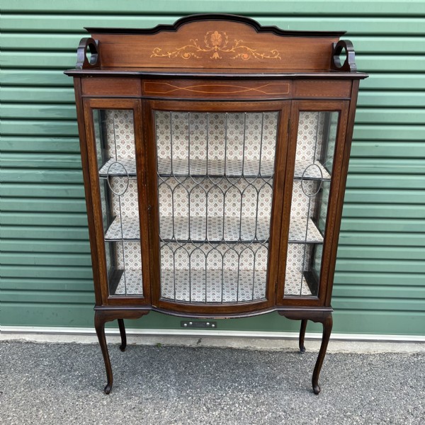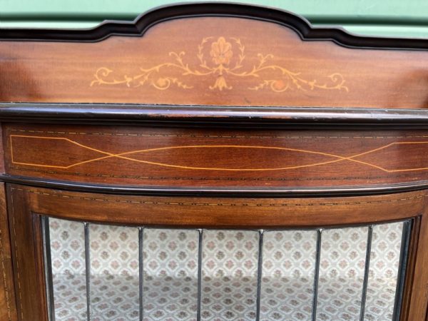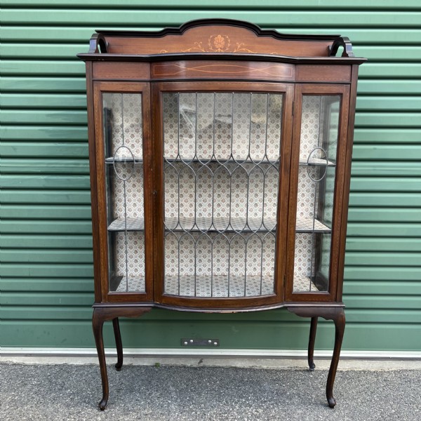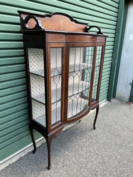 Victorian mahogany display cabinet with marquetry inlay, lead lite glazed panels raised on cabriole legs