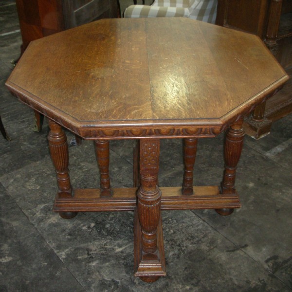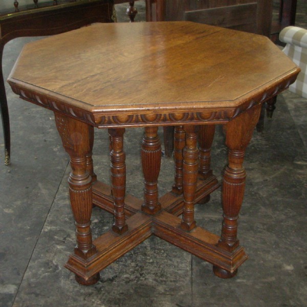 Victorian oak centre table with octagonal top with egg and dart moulding raised on turned carved and reeded supports that sit on a cross stretcher and bun feet.