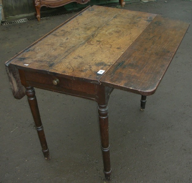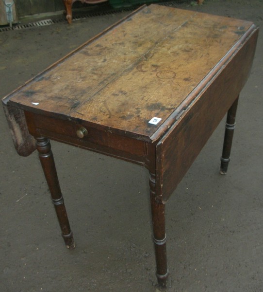 A Georgian oak Pembroke table the folding top supported on shaped and hinged brackets. The single drawer constructed with hand cut dovetails and has a single brass knob raised on gun barrel turned legs. A drop leaf measures 220mm giving it a total of 950mm when both leaves are in use.