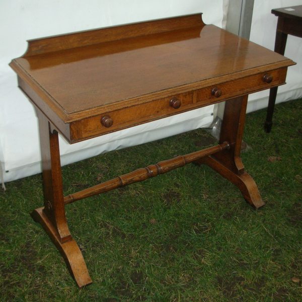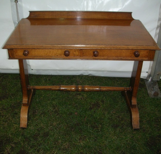 Victorian oak side table the top has a small shaped up stand with two drawers each with hand cut dovetails and turned mushroom knobs. Raised on shaped supports with turned stretcher.