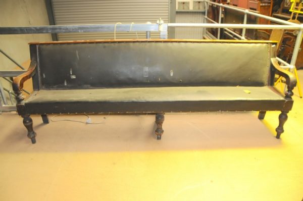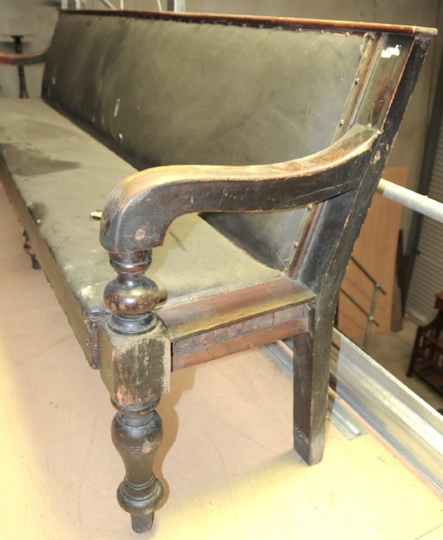 A mid Victorian mahogany waiting room bench seat. It has an upholstered seat and back rest and is raised on turned legs that terminate with spherically turned arm supports, the arms are shaped and scrolled. The restored price does not include re-upholstery.